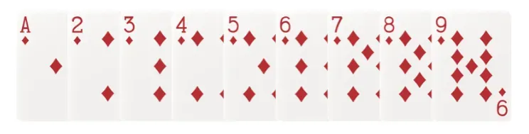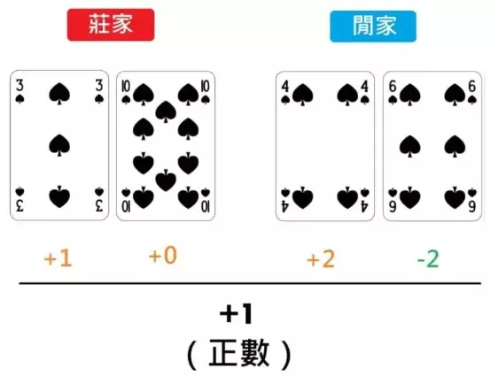 流水數:將牌A、2、3、4計為+1;牌5為-2;牌7為-3;牌6為+5;牌8為-5;牌9、10、J、Q、K則計為0。再把開牌結果套入公式,當正數與負數相互抵銷後,得出的結果就是「流水數」。